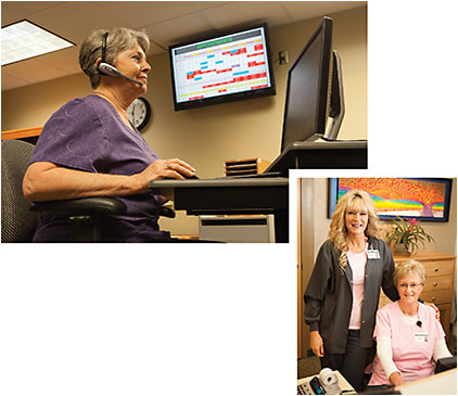Above, Triage Technician Betty Matthews takes a call. At right, Melissa Pressley (standing) and Sandra Presley work the front desk at Asheville Eye Associates.