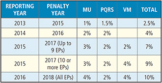 Payment is affected by not participating in PQRS or by the assigned quality tier made by CMS. For example, soloists and practices with two to nine EPs who opt not to participate in PQRS this year will automatically receive a 2% VM penalty — this is in addition to the 2% penalty they will receive for not participating in PQRS. Choosing to participate in PQRS for 2015, those same practices may receive no VM penalty or an upward adjustment of up to 2% based on the quality tier assigned by CMS. For more information, see the CMS’ website (http://tinyurl.com/OPpenalties3).