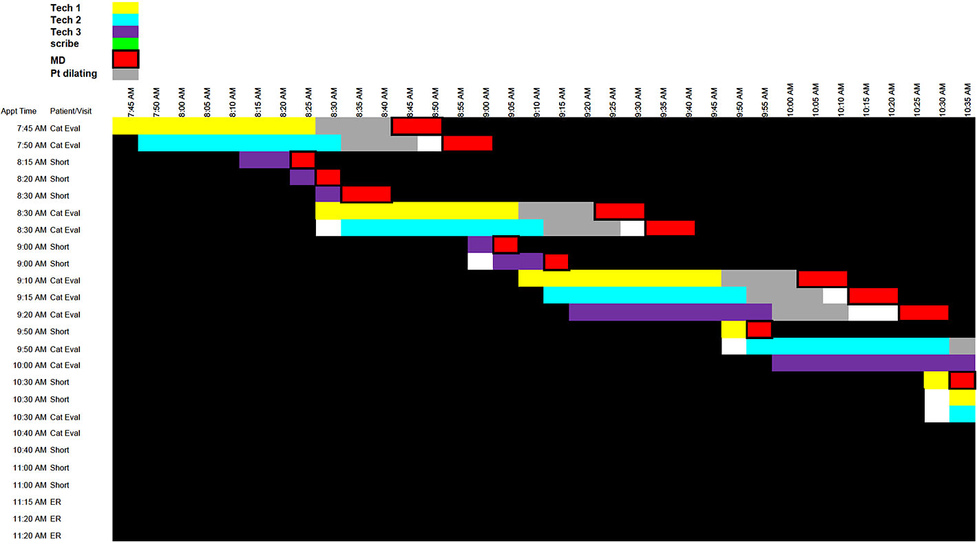 Too often, practices build schedule templates thinking about the patient’s arrival time. Instead, base schedules on how the provider will move from exam room to exam room. In an ideal ophthalmic clinic flow, the doctor moves from one room to the next without having to wait for the technician to finish a patient work-up. Figure 1 (page 35) is a diagram that one practice used to build its cataract evaluation clinic. Notice that the doctor will see the patient who arrived at 8:15 a.m. for a short visit before he sees the cataract evaluation patient who arrived at 7:45 a.m. The cataract patient does not have any wait in the process because of the required work-up. To build a template this way, complete a time and motion study to determine average times for the doctors and technicians during the various stages of an exam and diagnostic testing.