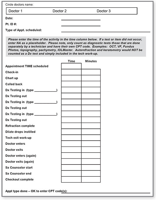 Many of today’s electronic health record (EHR) systems time-stamp the medical record when a patient moves from the reception area to work-up area, from the work-up area to the dilating area, and so forth. For practices with EHR systems that track time, it should be fairly easy to generate a report indicating the average minutes it takes for each exam component. If not, conduct a manual study. Picking a “typical” two-week period and having a time-tracking form (see Figure 2, page 36) that “moves” with the patient is recommended. Fill in the times as patients begin and complete each step, and then later enter the minutes into an Excel workbook to calculate the averages. At minimum, collect the following data to build scheduling templates: