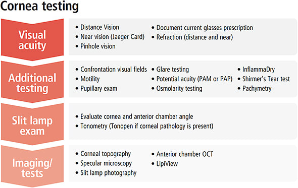 The initial work-up in a cornea clinic can reveal context into the patient’s general health, eye history, and behavioral/mental health. For example, women entering menopause can present with severe dry eye symptoms. Previous blepharoplasty or LASIK procedures could accelerate symptoms of eye discomfort. Some systemic medications, such as amiodarone, may result in classic chronic corneal changes, such as corneal verticillata. The cornea technician must document complex histories and perform difficult examinations, all while keeping the clinic flowing efficiently. Here, we will discuss some of the necessary duties that cover the cornea clinic work-up.