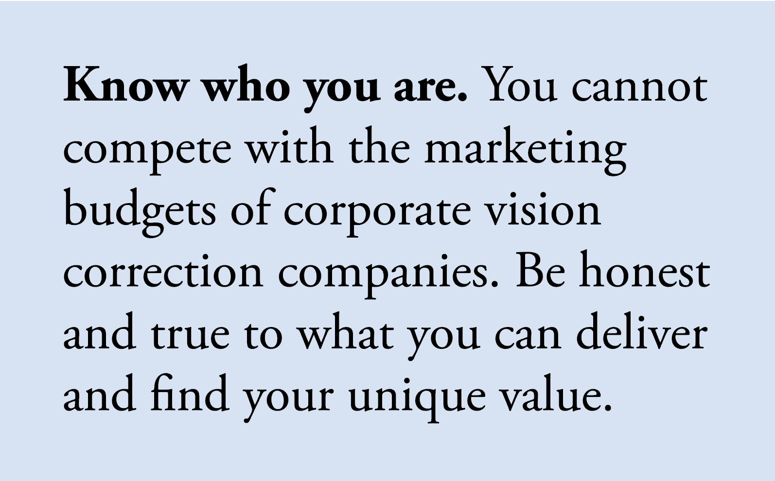 1. Understanding your brand and unique offer. Your brand should align with your messaging, facilities and staff. Ask yourself: What makes your practice stand out? Are you offering a unique surgical approach, specialized care or exceptional patient service? Also, if you were a patient unfamiliar with ophthalmology, would your communication and each visit instill trust and value? Once you've identified your brand, it’s crucial to communicate it effectively through all marketing touchpoints.