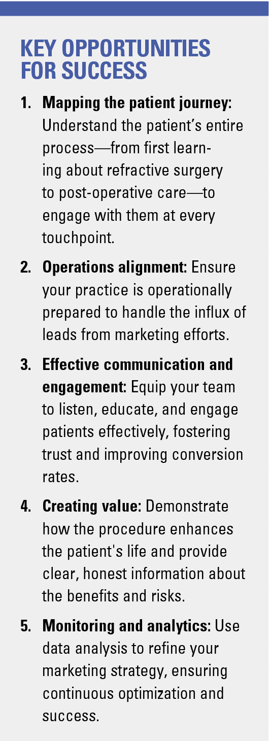 Refractive surgery practices today are at a pivotal point within the field of Ophthalmology. These practices offer a combination of clinical consultation and surgical care for patients opting for elective—and often expensive—procedures. However, reaching these patients at the right time with the right message requires a finely tuned marketing strategy. Equally important is a well-organized operation that supports each step of the patient journey.