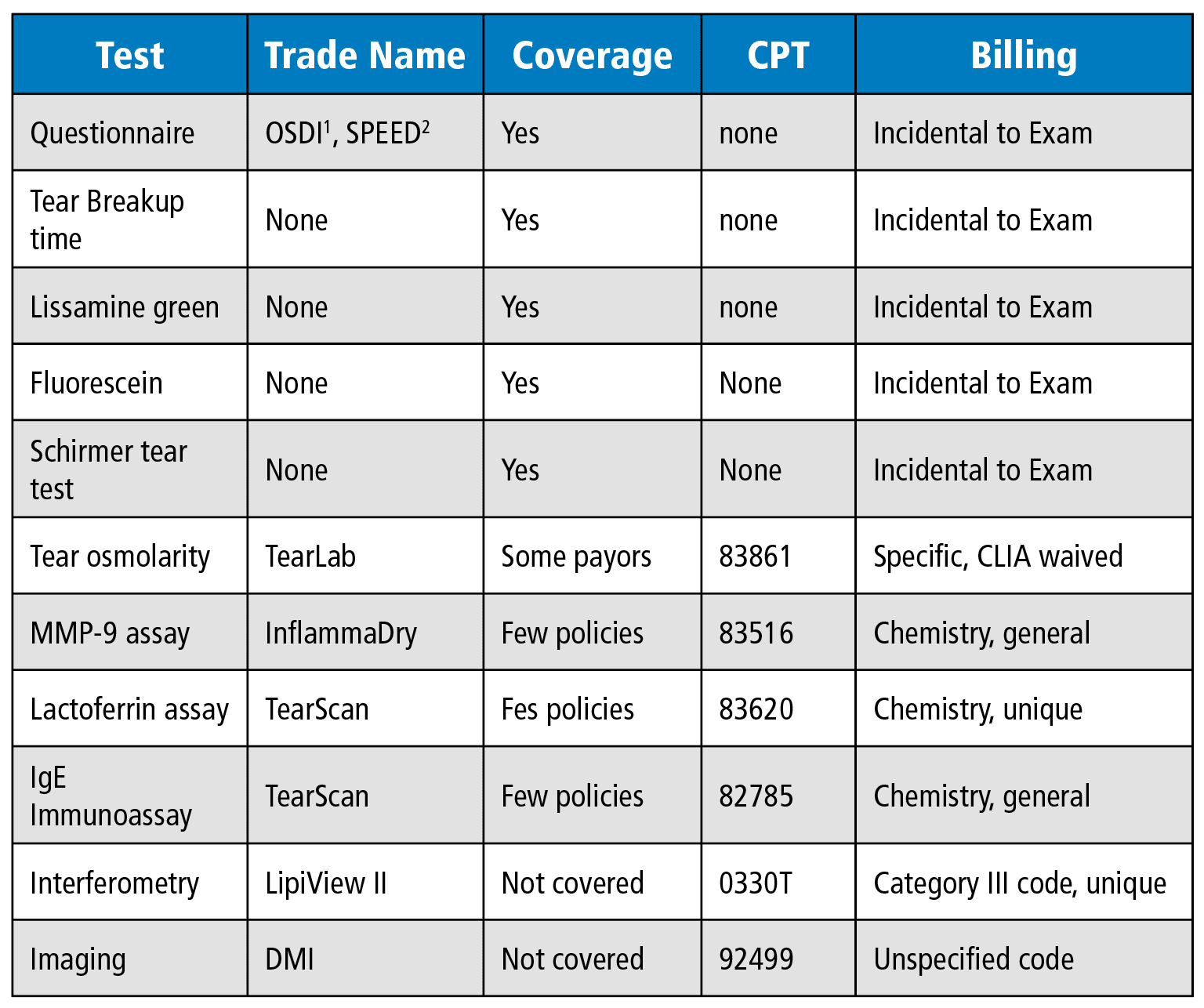 A variety of diagnostic tools can be employed to diagnose and assess DES and ocular surface disease, including patient questionnaires, lab tests and diagnostic tests. Not all are separately billable. See Table 1 below.