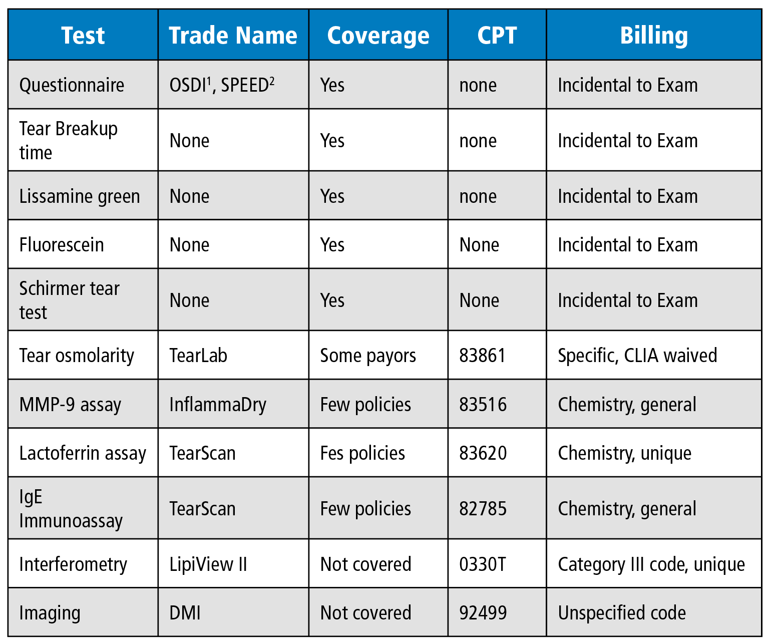 A variety of diagnostic tools can be employed to diagnose and assess DES and ocular surface disease, including patient questionnaires, lab tests and diagnostic tests. Not all are separately billable. See Table 1 below.